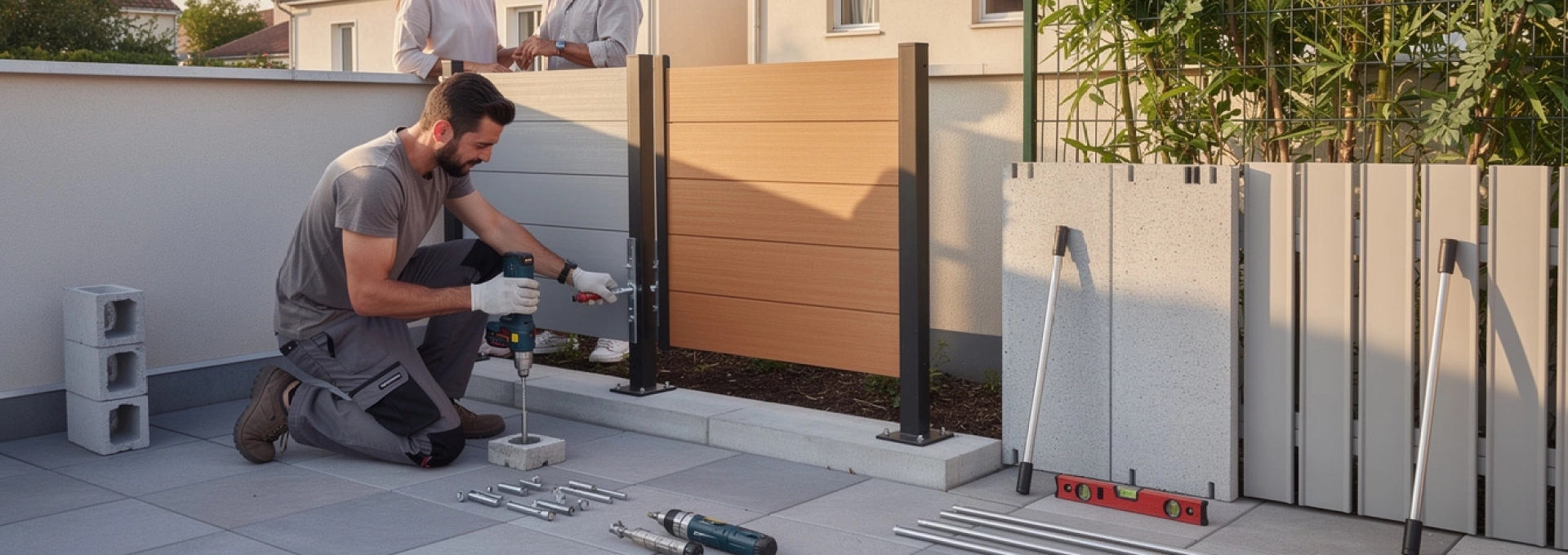 Sur une terrasse, ces systèmes nécessitent cependant une analyse fine de la structure porteuse : la charge des panneaux béton n’est pas négligeable et impose des fondations dimensionnées, voire un renforcement de la dalle existante. L’avantage des gammes préfabriquées Weser ou KP1 tient à leur caractère modulaire : panneaux de largeur standard, poteaux rainurés, éléments d’angle et couvre-murs facilitent une mise en œuvre rationnelle tout en garantissant la continuité esthétique. Pour une séparation mitoyenne, il est judicieux de discuter en amont avec le voisin du rendu final, car la face visible sera partagée et difficilement modifiable après coup.